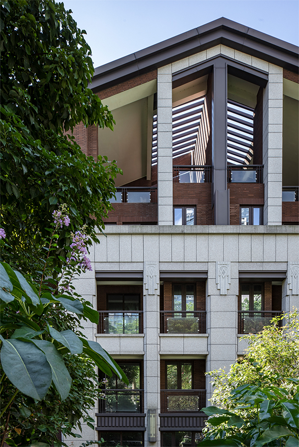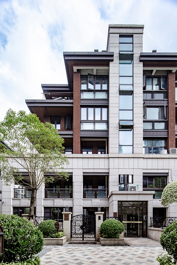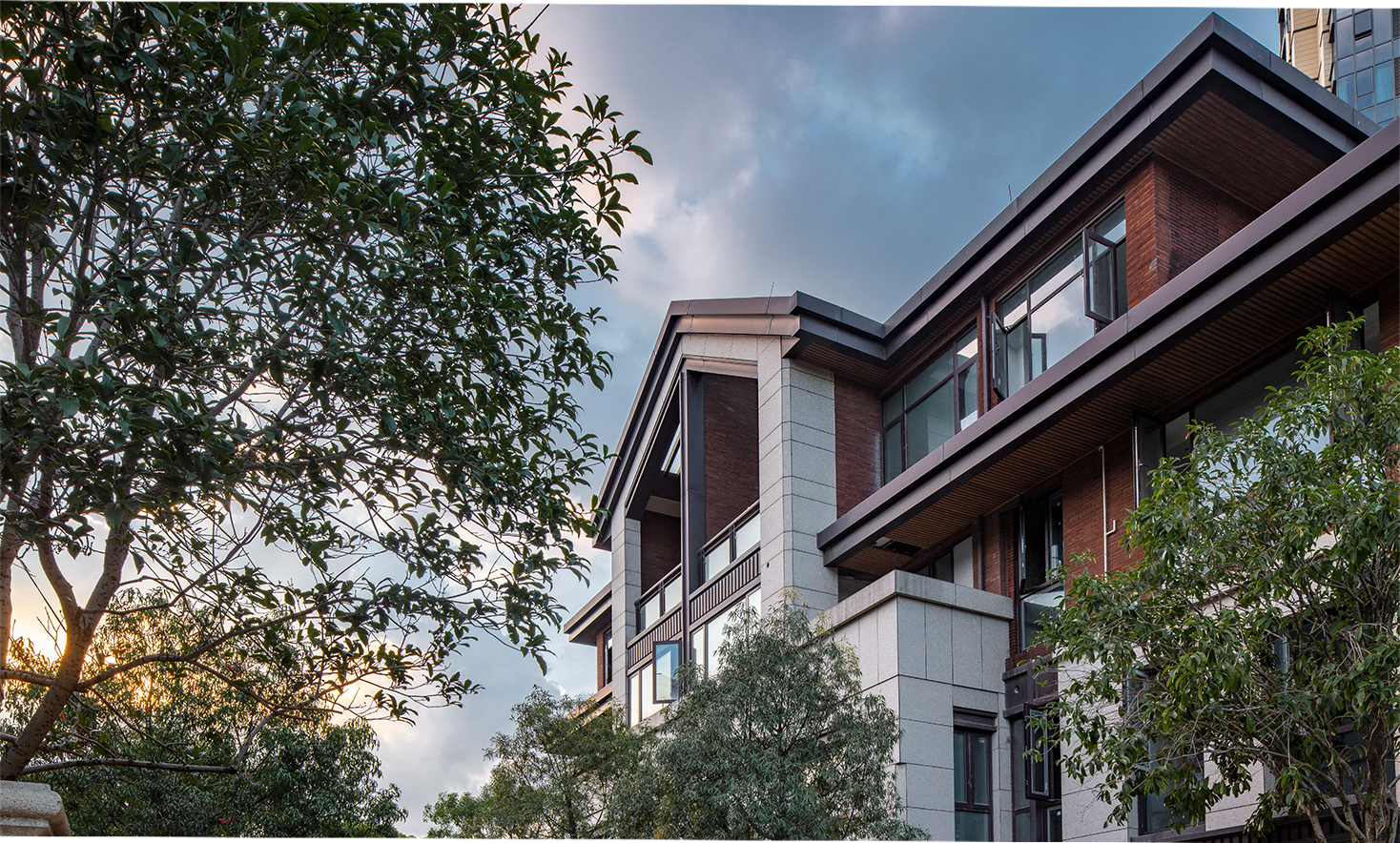別墅區(qū)外立面選用“賴特草原風(fēng)格”,厚重的石材基座、磚紅色條磚、大尺度外挑的四坡頂均是風(fēng)格重要的建筑語(yǔ)言??紤]到項(xiàng)目都市核心區(qū)域,立面設(shè)計(jì)中在風(fēng)格基礎(chǔ)上多增加了建筑細(xì)部的處理,檐口的細(xì)部、檐底的木飾面、基座的石材細(xì)節(jié),讓“草原風(fēng)格”別墅狂野的個(gè)性有所收斂。