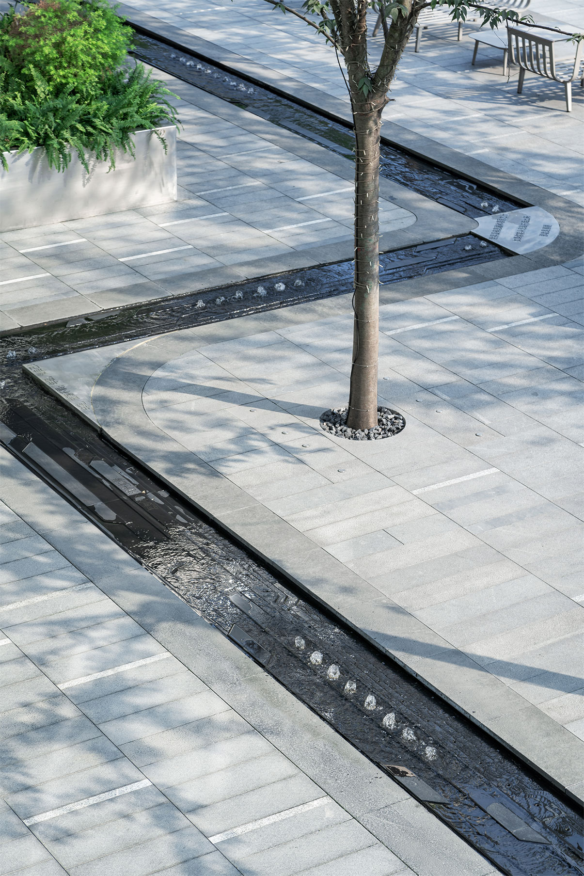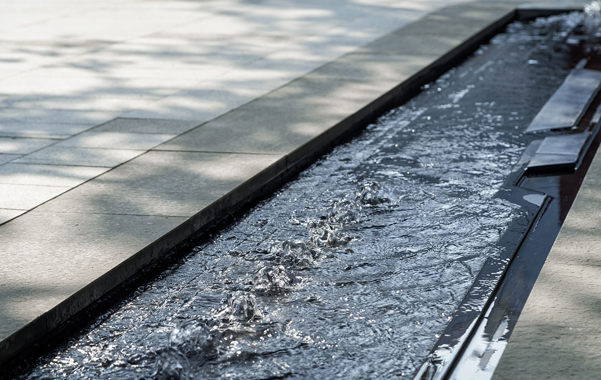 核心水帶也是售樓部最精致也是不可或缺的亮點。水下黑色石板的紋路同樣演繹了集成電路的形式語言;端頭不銹鋼板的明亮簡練、噴泉的低吟、水聲的泠泠,為大空間增添了幾許靈動,水帶上隱約可以探尋的陰刻文字又如同心靈之聲的淺唱。在此,動與靜,靈與逸,完美結(jié)合。