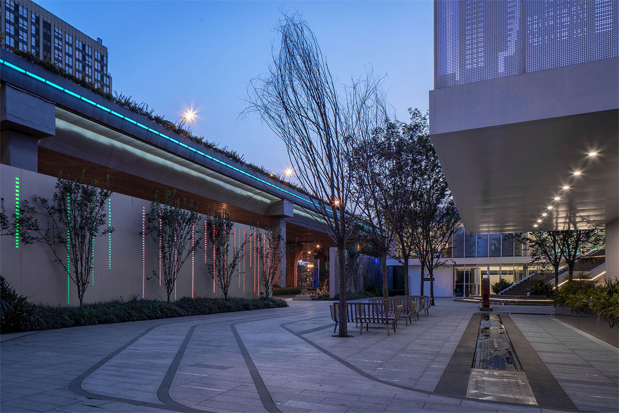 而項目面向都市潮智新人的定位又激起了設(shè)計師對于“都市樂谷”概念的思考。于是景觀設(shè)計以“創(chuàng)新智趣”與“都市樂谷”為概念雙向展開,將集成電路的科技韻律之美融入到音頻波動的樂章節(jié)奏之美中,形成項目獨特的精神氣質(zhì)。