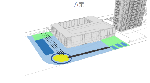 示范區(qū)的設(shè)計(jì)要求是實(shí)景呈現(xiàn),因此需要關(guān)注展示期和永久使用期的無(wú)縫銜接。建筑外圈7米寬未來(lái)車(chē)道界定了總長(zhǎng)度約100米的L形外場(chǎng)空間,景觀軸心很自然地安放在道路轉(zhuǎn)角的節(jié)點(diǎn)處。