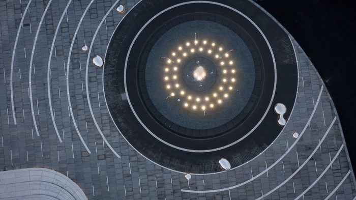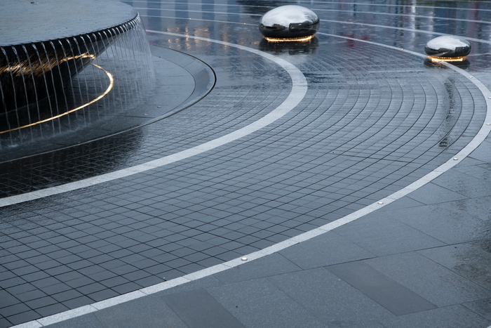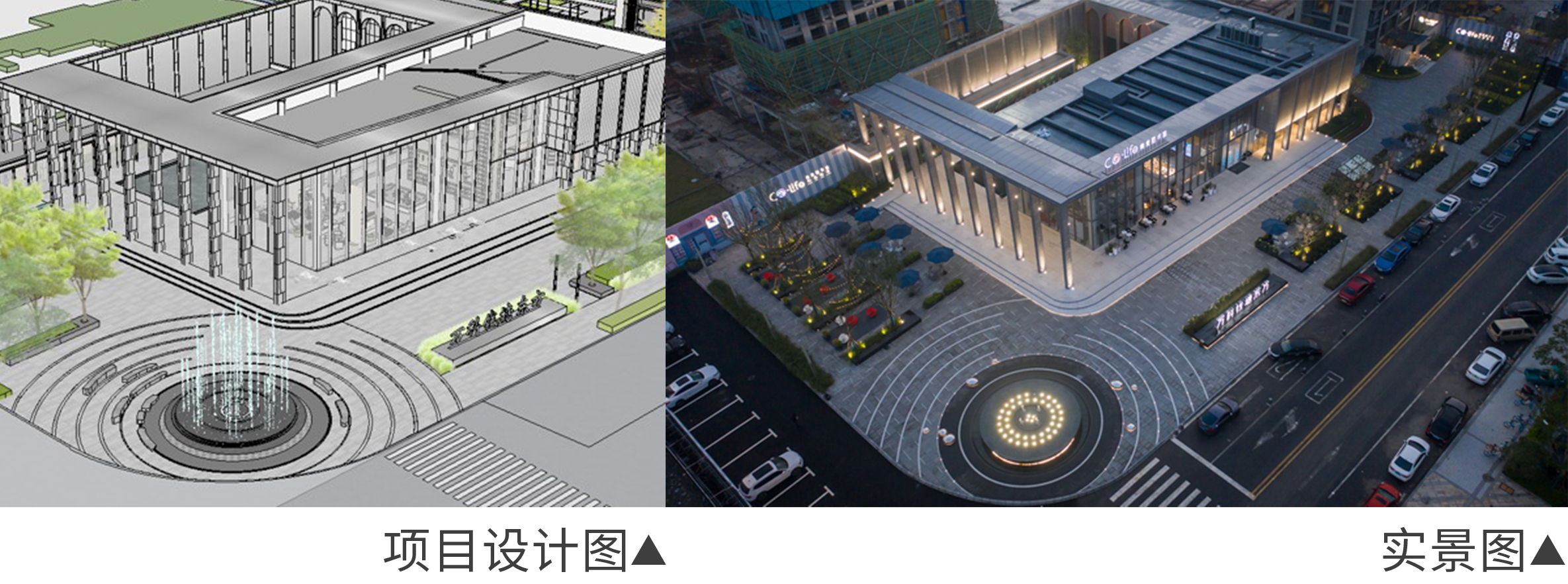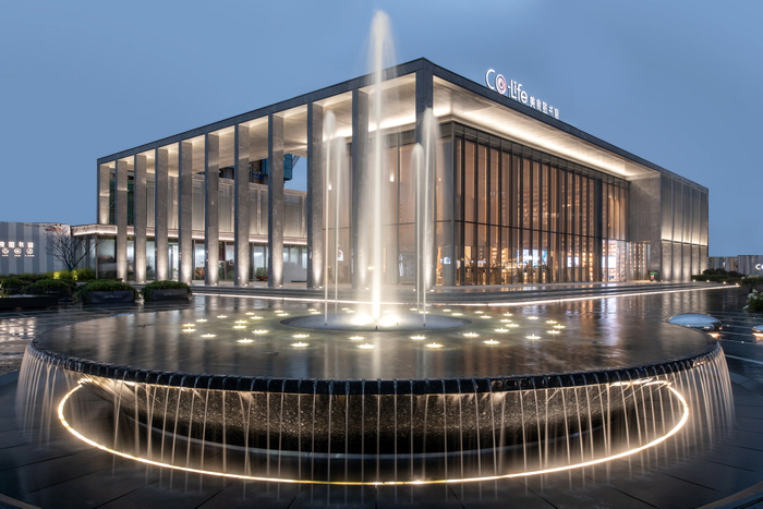 水盤(pán)周圈石材的特色處理形成珍珠一般垂落的串串水線(xiàn),夜晚在地埋環(huán)形燈帶的映襯下,更如皇冠般熠熠生輝。