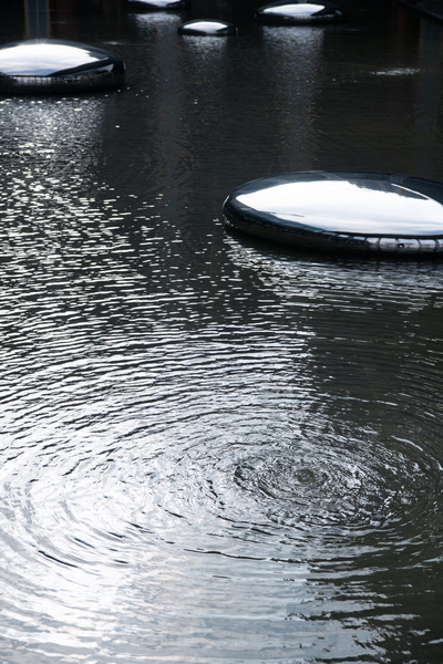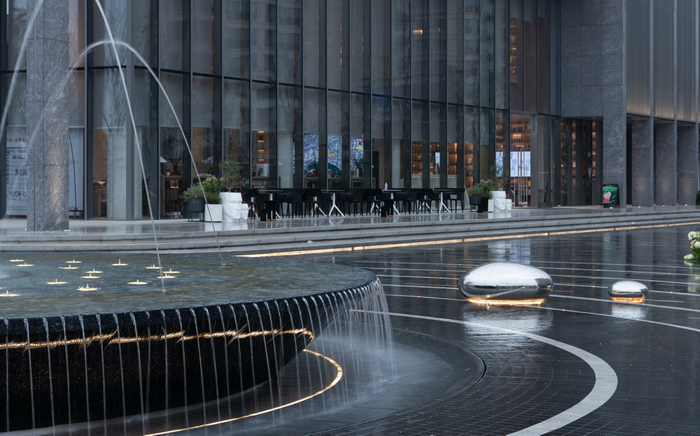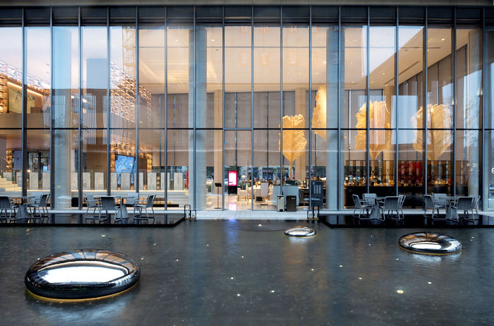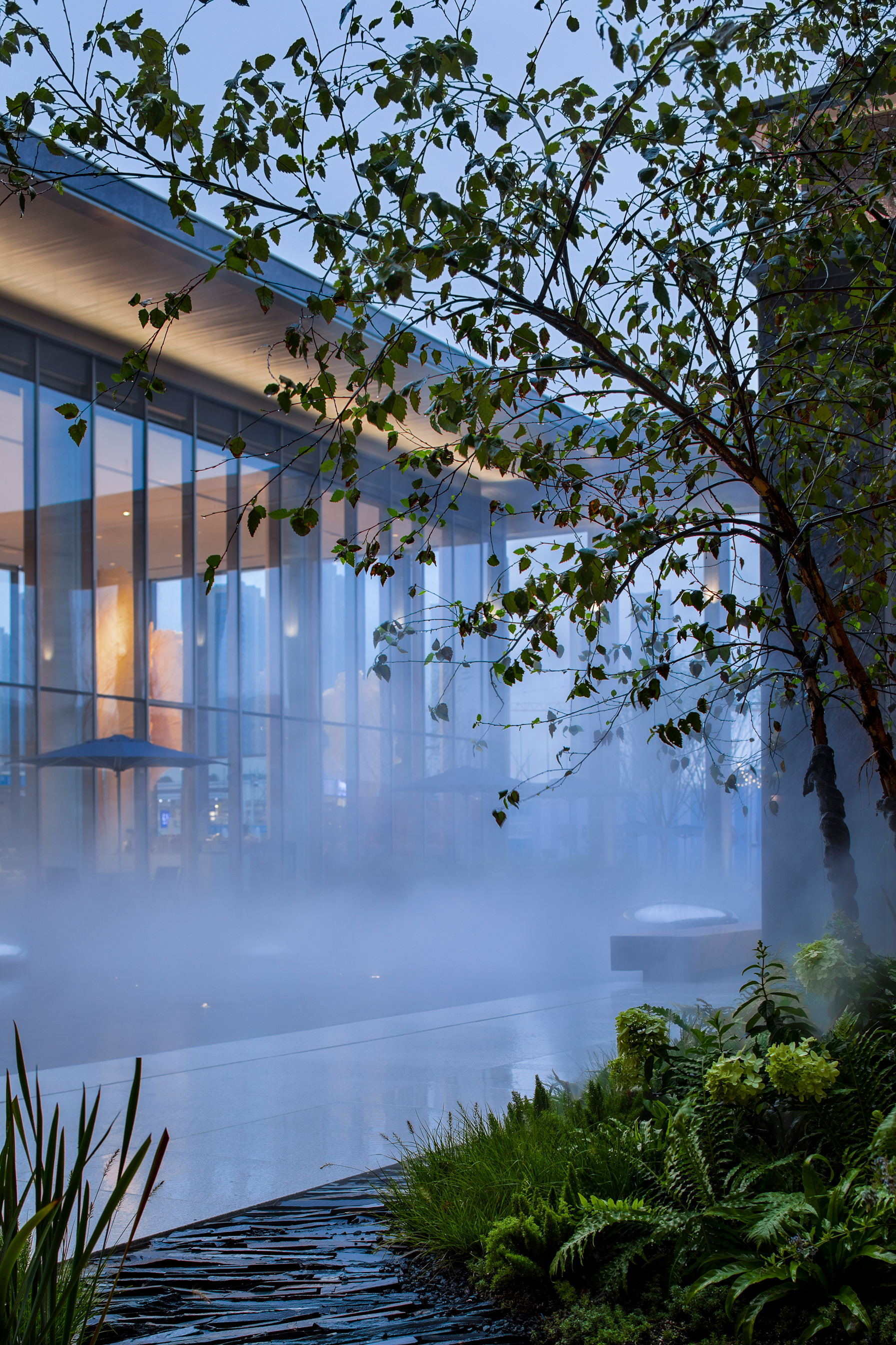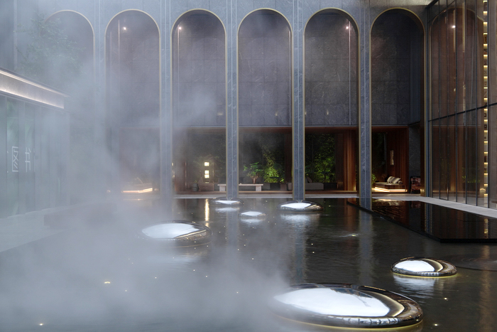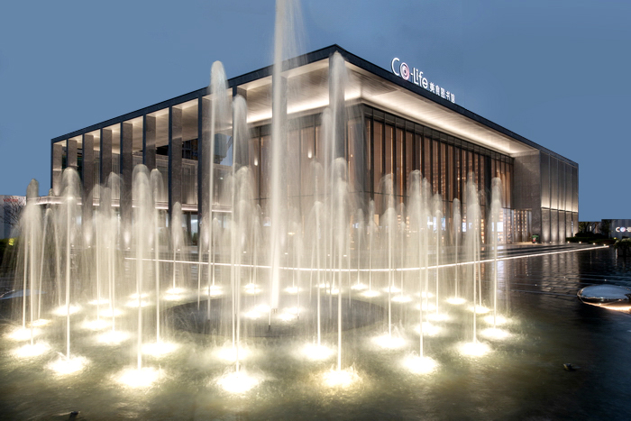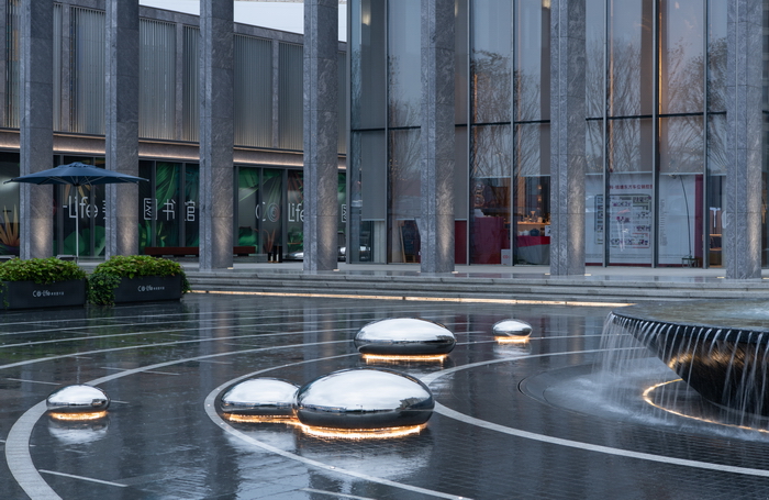 建筑倒映在鏡面水上,輝煌璀璨;星光點(diǎn)點(diǎn)的水池中貼合水面的不銹鋼水滴雕塑群忽明忽暗,如同呼吸的節(jié)奏;霧森如夢(mèng)似幻;漣漪涌泉帶著慢慢蕩開(kāi)的哲思靜靜地噴涌。