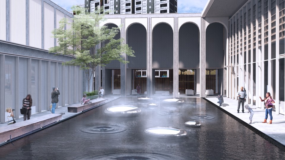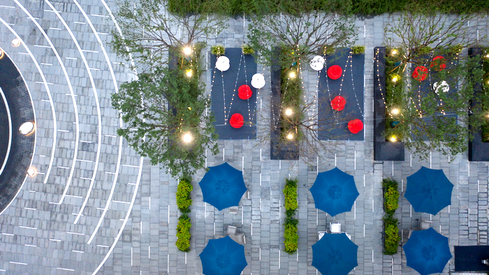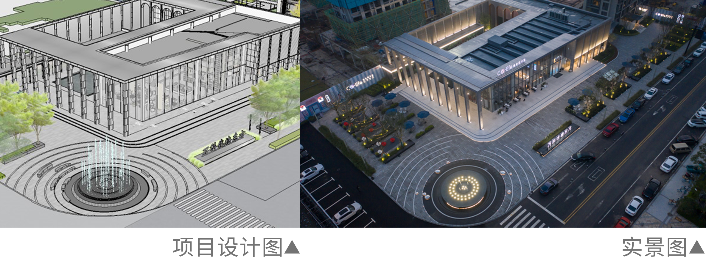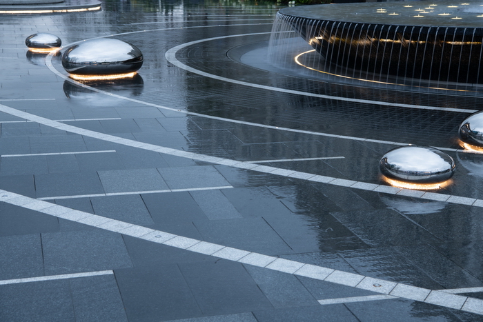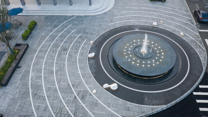 作為從下沙奧萊方向進(jìn)入場(chǎng)地的主要到達(dá)點(diǎn),我們以發(fā)散的同心圓承接住較為剛硬的建筑角部,疆界自然圓融地向外拓展,開(kāi)放出一個(gè)如同打開(kāi)雙臂呈迎接狀的“引力口袋”。以紐約林肯中心為設(shè)計(jì)靈感的直徑8.2米的互動(dòng)引力噴泉水盤(pán)中,三種不同形態(tài)的噴泉交相輝映,形成熱烈歡快的迎賓氛圍,晶瑩璀璨的鏡面不銹鋼水滴藝術(shù)小品散落四周,營(yíng)造藝術(shù)互動(dòng)情趣。