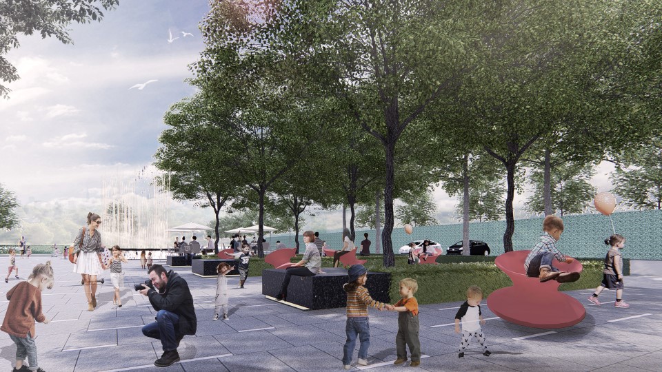 水盤(pán)周圈石材的特色處理形成珍珠一般垂落的串串水線(xiàn),夜晚在地埋環(huán)形燈帶的映襯下,更如皇冠般熠熠生輝。水盤(pán)的設(shè)計(jì)也并非只能遠(yuǎn)觀不可褻玩,小朋友和水盤(pán)的近身互動(dòng)也是未來(lái)充滿(mǎn)活力和溫度的生活場(chǎng)景。