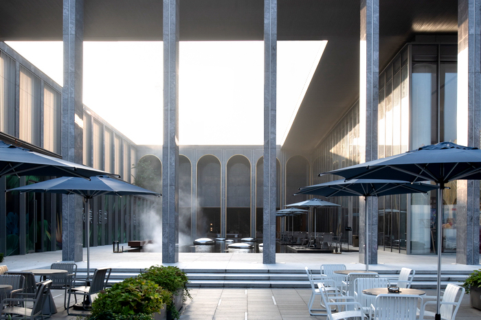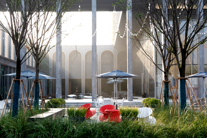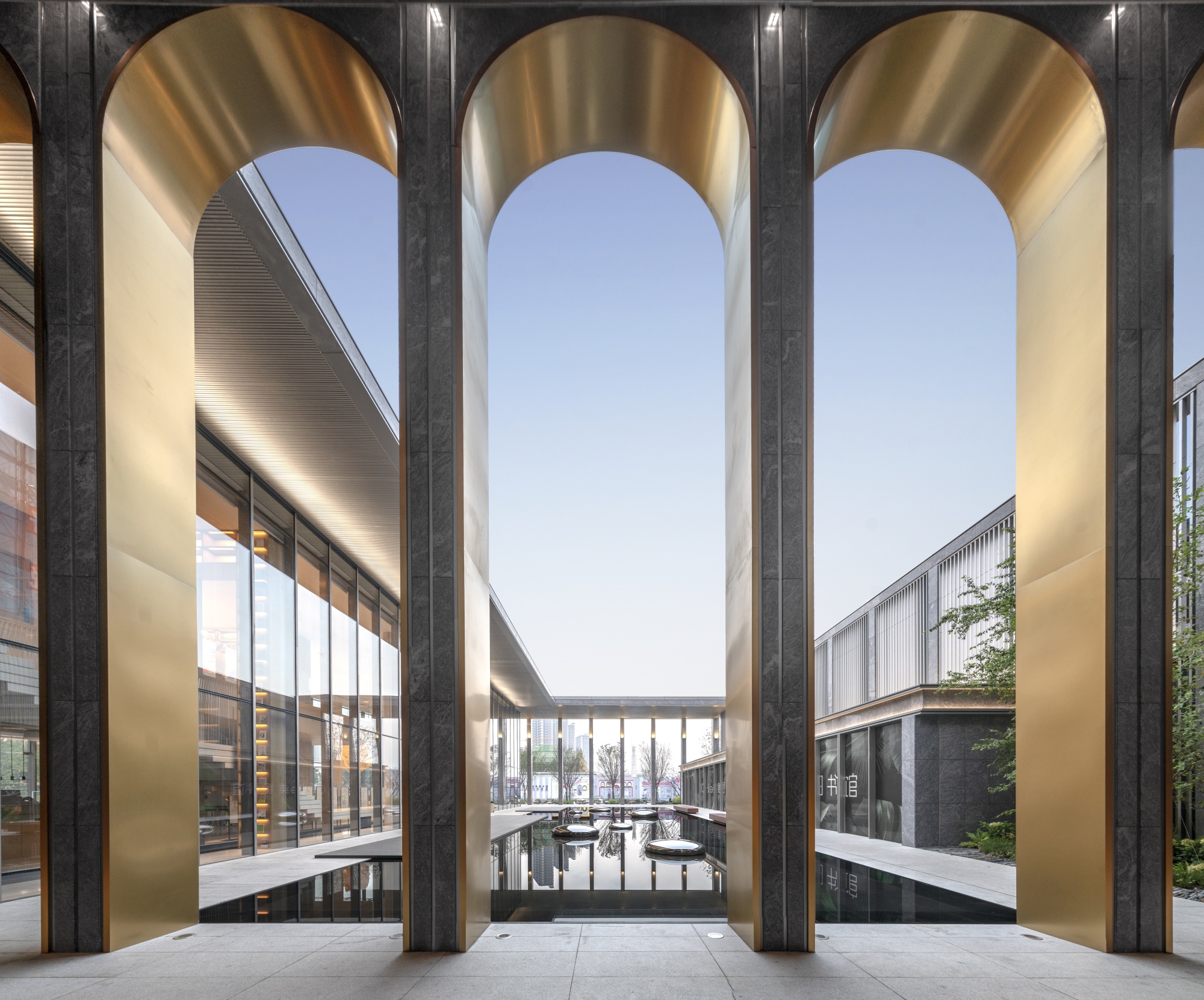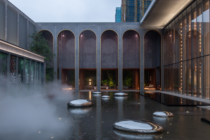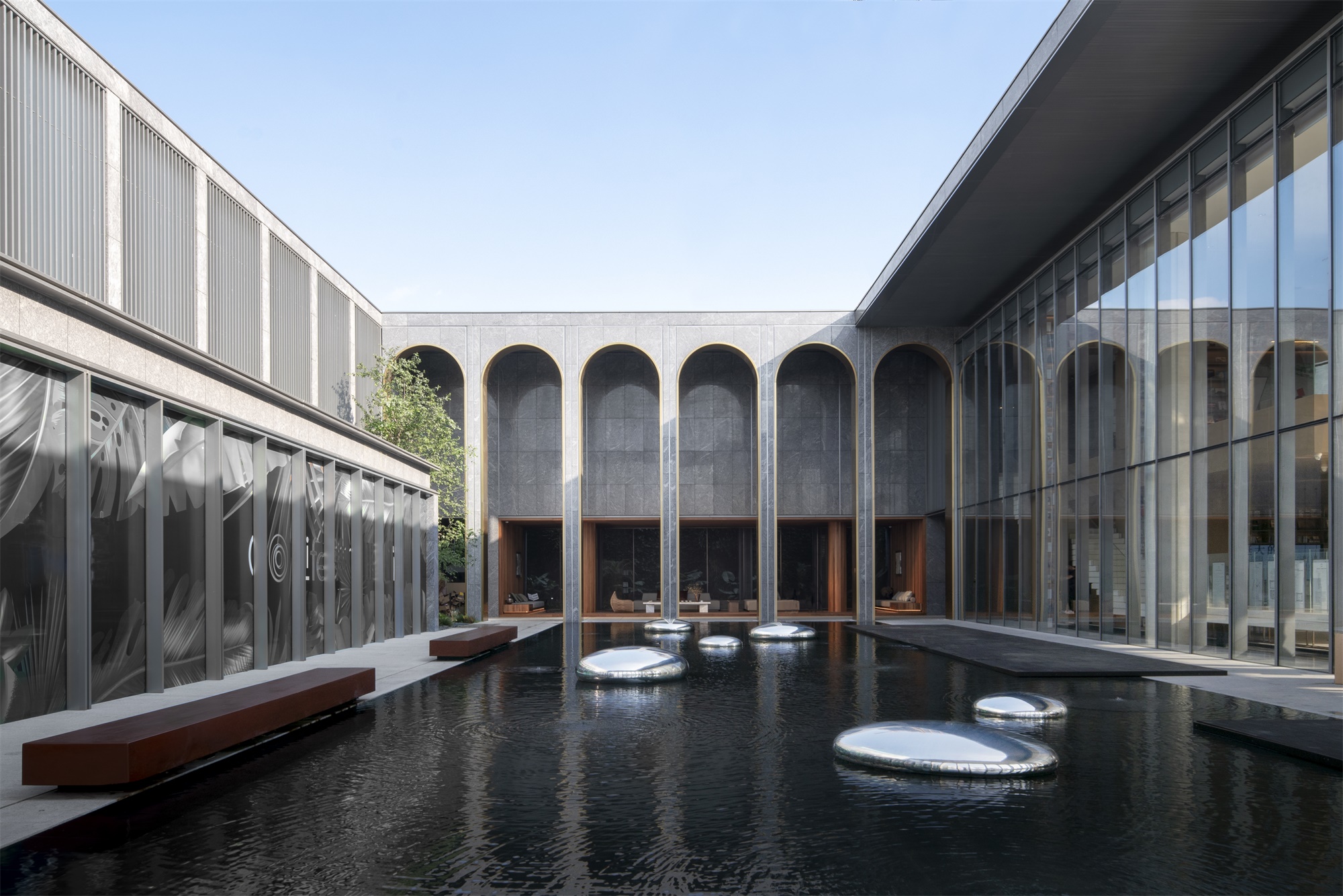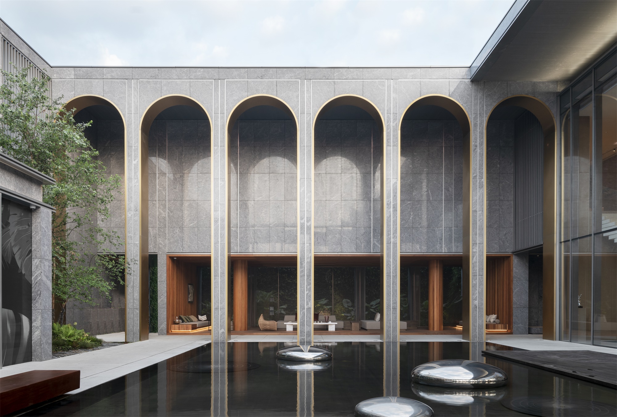 10米挑高的建筑柱廊圈出的內(nèi)庭空間 - “無(wú)界秘境”是整個(gè)示范區(qū)最具戲劇感的存在。周圈建筑立面顯著的豎線(xiàn)條形成強(qiáng)烈的韻律感。