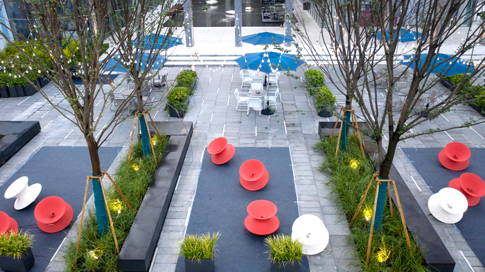 在建筑語(yǔ)匯已經(jīng)極其豐富的這個(gè)內(nèi)庭空間,我們非常審慎地選擇景觀搭配的方式,力求和融共生,在不經(jīng)意間實(shí)現(xiàn)總體環(huán)境品質(zhì)和氣質(zhì)的提升。