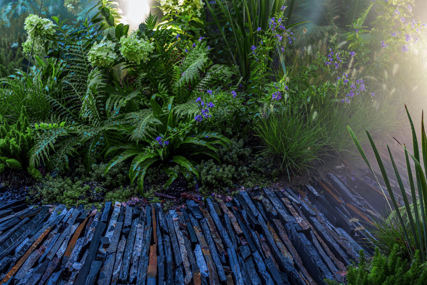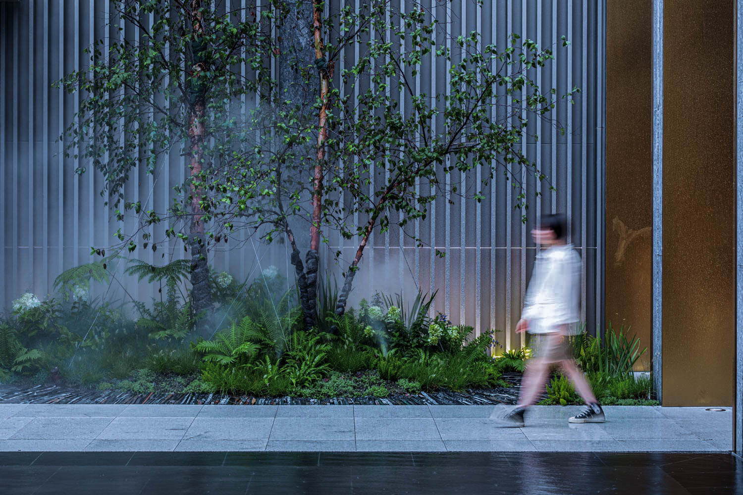 在內(nèi)庭無(wú)界秘境的主場(chǎng)景之外,我們還安排了兩處小確幸般的存在:一處是在水庭拐角一隅獨(dú)自美麗的以三兩株拼配河樺為主景的綠葉花境綠植區(qū);