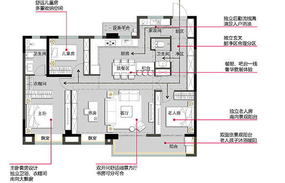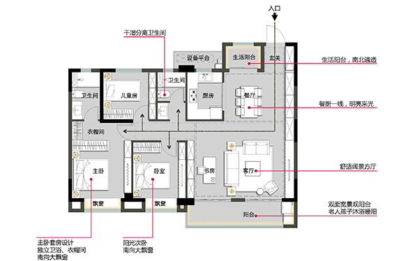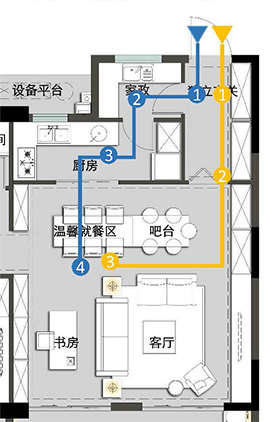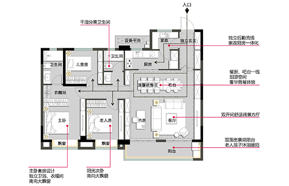 該洄游將入戶分為“家政動線”與“居家動線”?!凹艺泳€”:玄關-家政間-廚房-餐客廳 動線,當買菜回家,或手上有重物回家時,先步入家政間處理,不必經過客廳、餐廳,避免傳統(tǒng)戶型中,入戶動線不分離帶來的污漬、污染等情況。 “居家動線”:玄關-過廳-餐客廳等,讓家人或訪客直接通過玄關進入客廳等空間,相較于傳統(tǒng)入戶動線,避免與家政動線的重合,保證生活的干凈與從容。