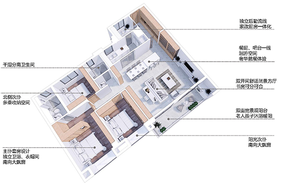 極致收納空間示意這是一次對業(yè)主需要什么樣的生活空間的探索;目前傳統(tǒng)型的產品設計基本組合形式是“公共空間+若干居住空間”,每個居住空間都很大、都能滿足收納、雙人床等;比如人們常講的三房兩廳兩衛(wèi)模式,這個“3”代表的就是3個功能級配相當舒適的雙人房空間;在以后,人們需要的是這種大而全的空間?還是更多獨立、私密的個性化空間生活?由此,我們做次生活方式的探索:13+2房,崇尚個性與私密的生活方式。