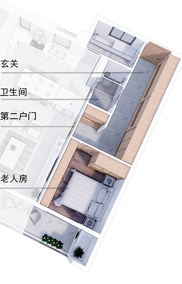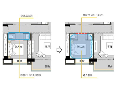 內外兩道推拉門控制衛(wèi)生間的可分可合,白天作為公共衛(wèi)生間、晚上組合成老人套房。