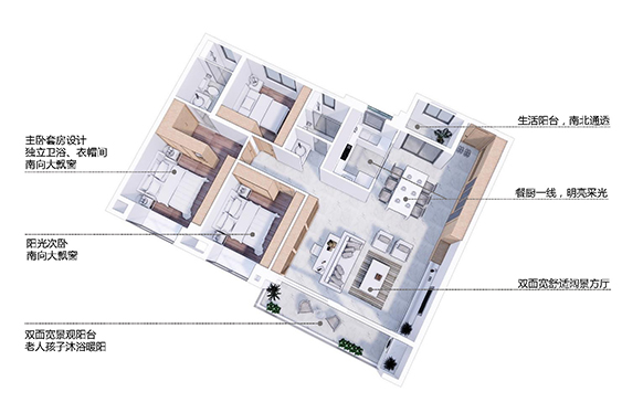 “多點陪伴是我對你們的承諾”闊綽客廳連接餐廳和大觀景陽臺,滿足三代同堂的家庭所需。父親的閱讀、妻子的看劇,母親的花藝,還有孩子暢談上學見聞,家庭的歡樂故事在此不斷上演。