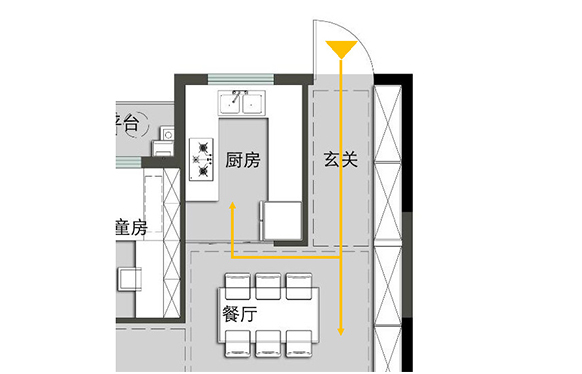中國傳統(tǒng)建筑中具有“藏”的概念,又稱入口前的空間為玄關,它是屋外和屋內的緩沖和物理分割。進入玄關,兩條動線互不干擾。爺爺接孫子放學回家可直接進入客廳玩耍,奶奶買菜歸來進入廚房烹煮,為一家人準備可口的飯菜,開啟幸福生活 ......