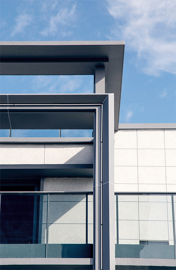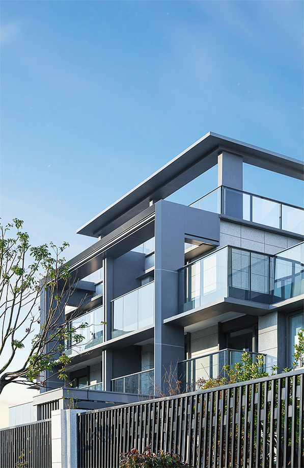 東方禪意與西方現(xiàn)代建筑對(duì)理性簡(jiǎn)約美的崇尚,在審美價(jià)值觀層面水乳交融,形成了獨(dú)特的現(xiàn)代典雅建筑風(fēng)格。現(xiàn)代典雅住宅建筑端莊大氣,設(shè)計(jì)圍繞“純凈簡(jiǎn)潔、輕盈飄逸”的理念,減少材料的種類,弱化了構(gòu)件的厚度,突顯形體的輕盈挺拔。每個(gè)形態(tài)單元的構(gòu)圖關(guān)系因此簡(jiǎn)化為白色墻面與玻璃之間大實(shí)大虛的鮮明對(duì)比。為塑造形體輪廓的輕盈挺拔,建筑立面主要的豎線條,均做內(nèi)收三角形斜切處理,并以鋁型材收邊。不同材質(zhì)的精美交接,使形體轉(zhuǎn)折更加明確,賦予建筑冷峻的骨感美。