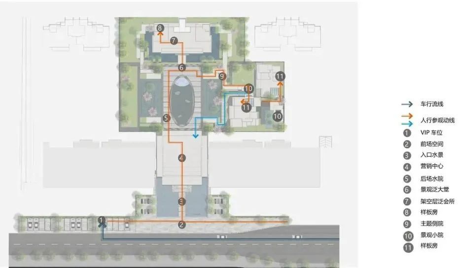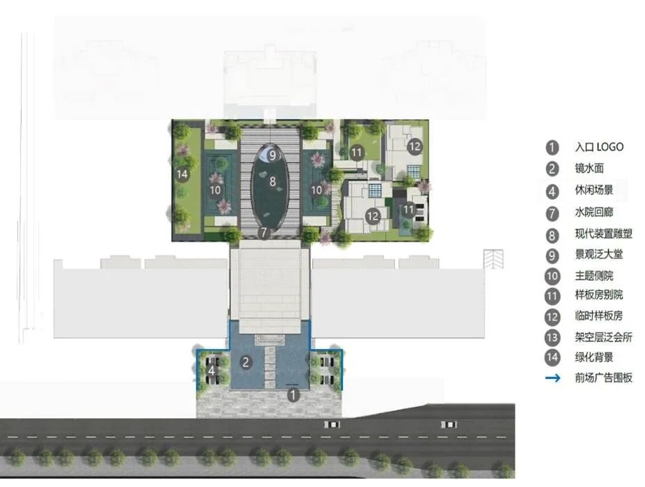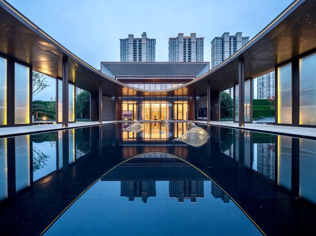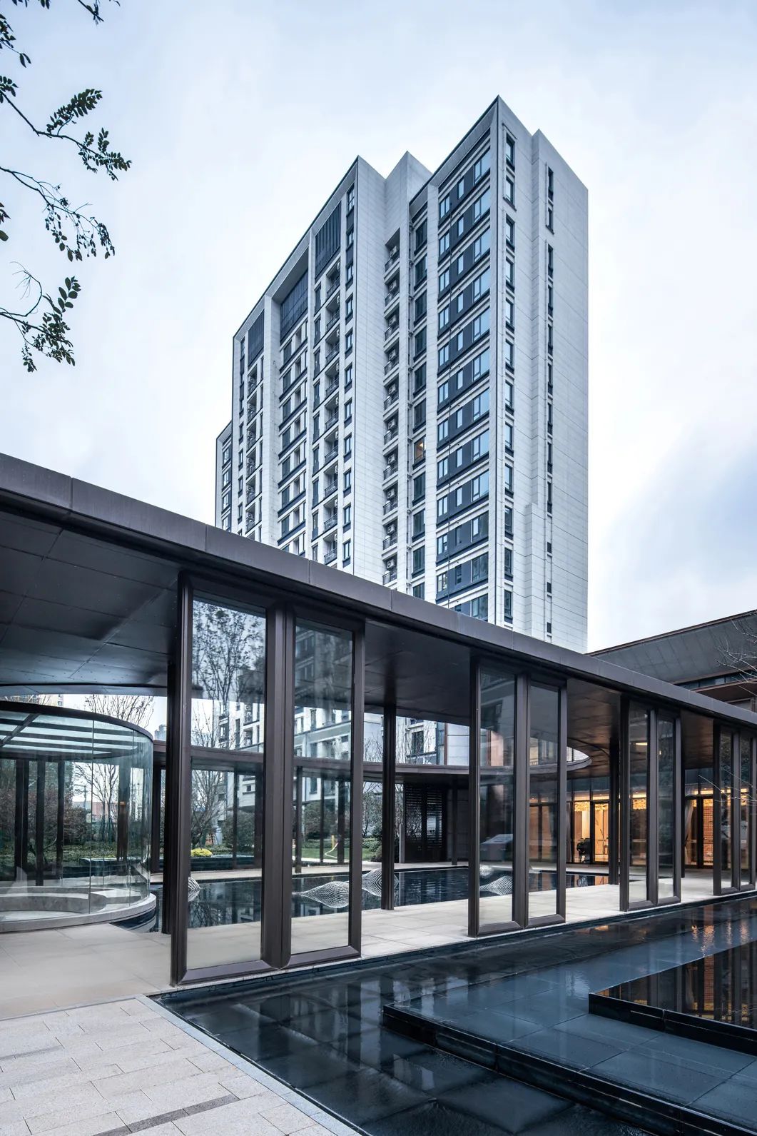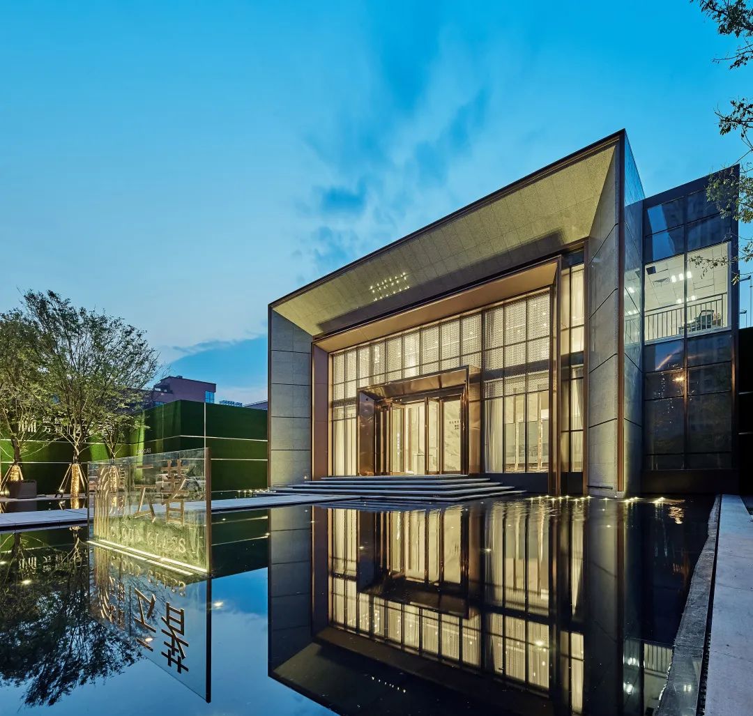 回應(yīng)城市,退讓部分地形,前場(chǎng)設(shè)置大尺度鏡面水,來(lái)形成前場(chǎng)空間和展示面。